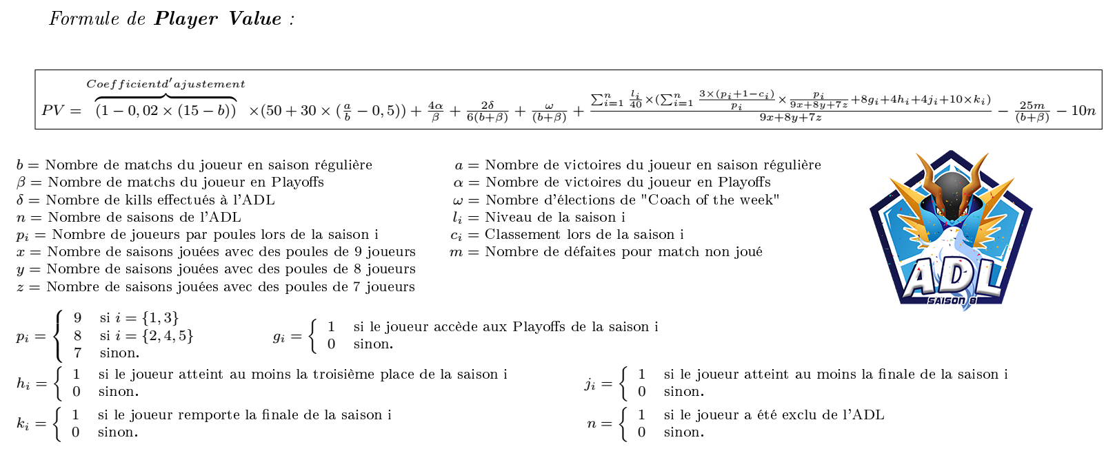 La statistique de Player Value est un indicateur des performances de chacun des joueurs ayant participé à l’ADL, crée en août 2018. La formule a évolué en 2021 Il s’agit d’une note sur 100 dépendant de beaucoup de paramètres et dans des proportions différentes. La formule est la suivante :